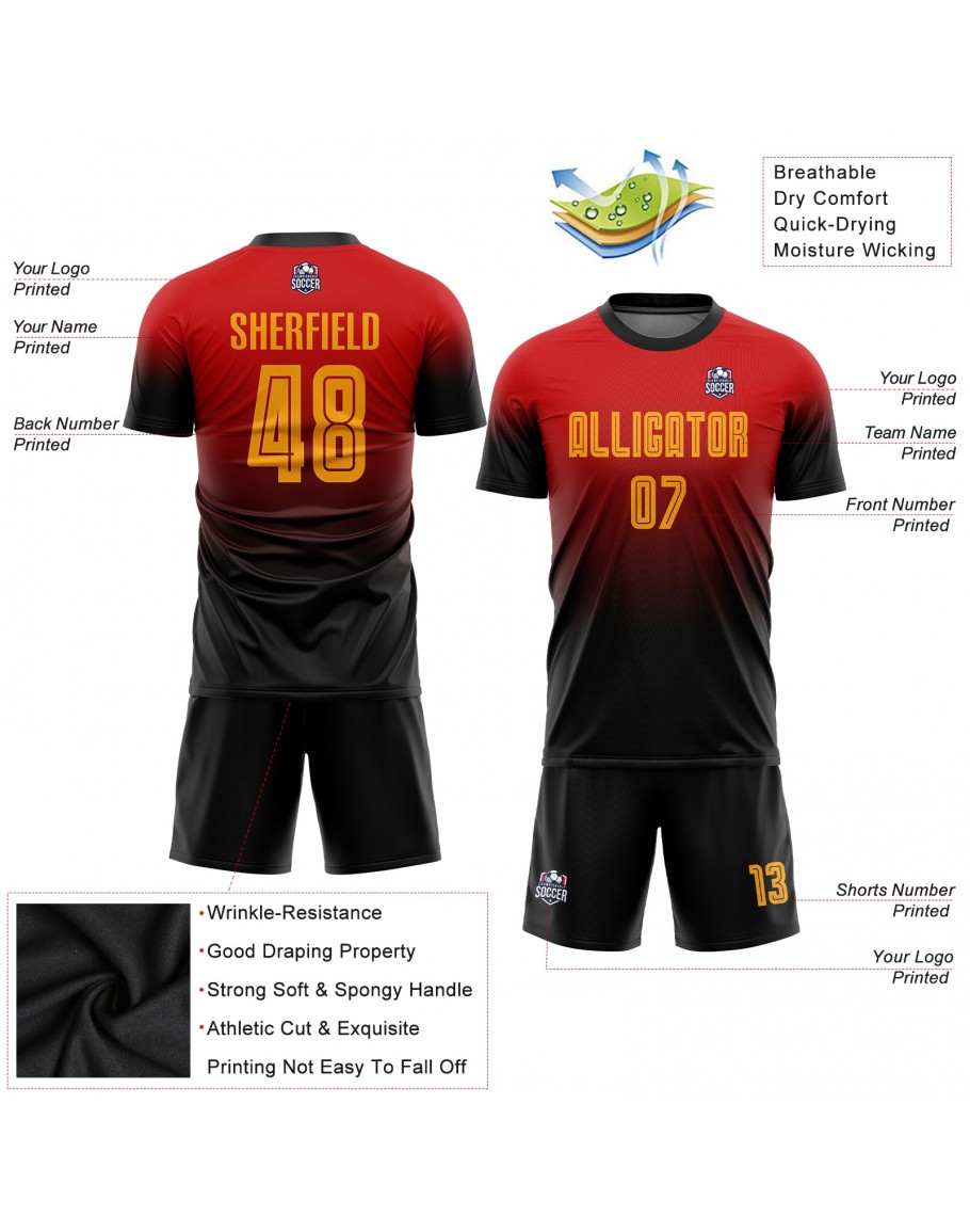 Custom Red Gold-Black Sublimation Fade Fashion Soccer Uniform Jersey
