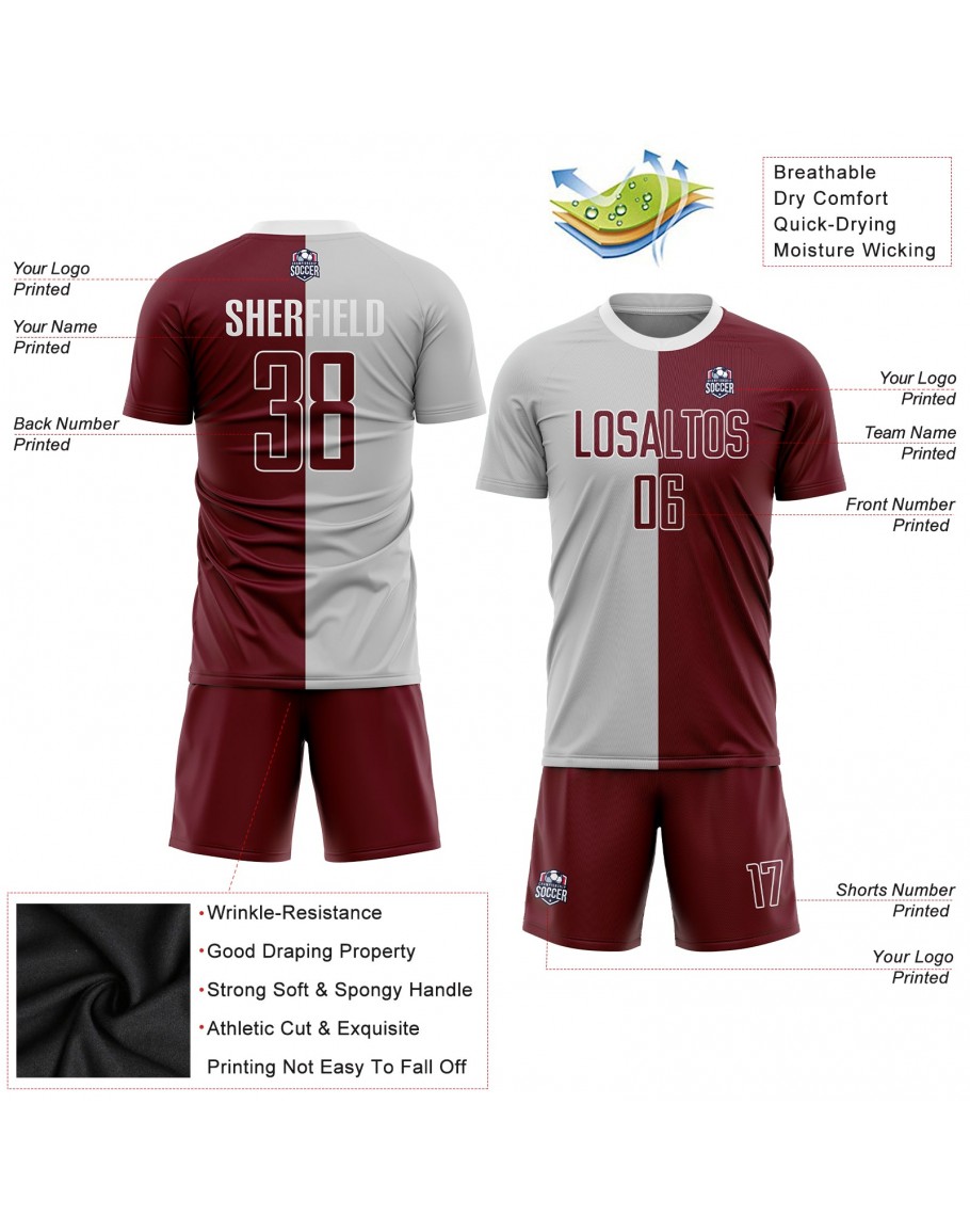 Best Pro Custom Gray Crimson-White Sublimation Split Fashion Soccer Uniform Jersey